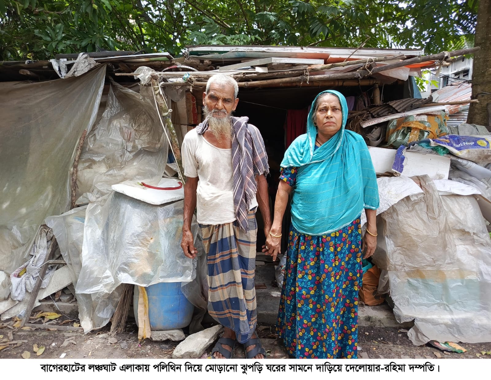 অভাবের তাড়নায় স্ত্রী-সন্তানসহ আত্মহত্যা কিংবা অভাবের কারণে সংসার ভাঙার খবর যখন শিরোনাম হচ্ছে প্রায়ই, তখন এক ভিন্ন দৃষ্টান্ত দেখা মিলেছে উপক‚লীয় জেলা বাগেরহাটে। বাগেরহাট পৌরসভার লঞ্চঘাট এলাকায় পলিথিন দিয়ে মোড়ানো একটি ঝুপড়ি ঘরে দীর্ঘ ১০ বছর ধরে বসবাস করছেন ৭০ বছর বয়সী দেলোয়ার হোসেন শেখ ও তার স্ত্রী ৫৮ বছর বয়সী রহিমা বেগম। বসবাসের অনুপযোগী এই ঝুপড়িঘরই তাদের একমাত্র আশ্রয়।