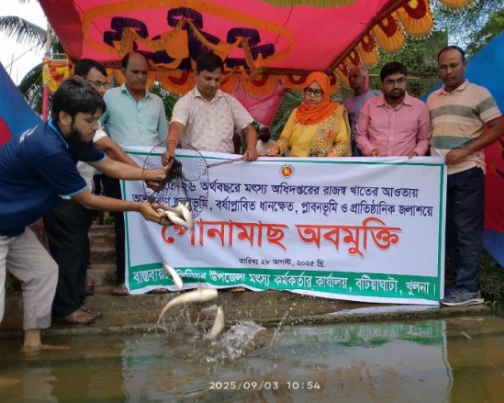 খুলনা বটিয়াঘাটায় ০৩/০৯/২৯২৫ তারিখ রোজ বুধবার সকাল সাড়ে ১০ টায় বটিয়াঘাটায় মৎস্য দপ্তরের উদ্যোগে ২০২৫-২৬ অর্থ বছরে বটিয়াঘাটা উপজেলায় বিভিন্ন সরকারি ও প্রাতিষ্ঠানিক জলাশয়ে মাছের পোনা অবমুক্ত করার জন্য মাছের পোনা বিতরণ করা হয়।