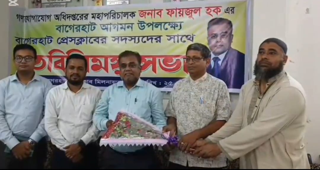 গণযোগাযোগ অধিদপ্তরের মহা পরিচালক ফায়জুল হক ২৫ সেপ্টেম্বর বৃহস্পতিবার বাগেরহাট প্রেস ক্লাবে কমর্রত সাংবাদিকদের সাথে মতবিনিময় কালে উক্ত মন্তব্য করেন। তিনি বলেন, সাংবাদিক রা রাষ্ট্রের ৪র্থ স্তম্ভ তাদের ঐক্যবদ্ধ থাকা সময়ের দাবী । মহা পরিচালকের আগমন উপলক্ষে বাগেরহাট প্রেসক্লাবের সভাপতি মো; কামরুজ্জামান সাধারন সম্পাদক তরফদার রবিউল ইসলাম প্রধান অতিথিকে ক্রেস্ট ও ফুলের তোরা দিয়ে শুভেচ্ছা জানান । এ সময় বাগেরহাট জেলা তথ্য অফিসার মইনুল ইসলাম, বাগেরহাট প্রেসক্লাবের কর্মকর্তাগন প্রিন্ট ও ইলেকট্রনিক মিডিয়ার প্রতিনিধিরা উপস্থিত ছিলেন।