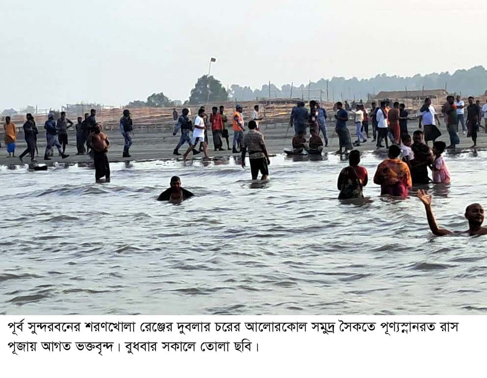 পূণ্যস্নানের মধ্য দিয়ে শেষ হয়েছে পূর্ব সুন্দরবনের শরণখোলা রেঞ্জের দুবলার চরে সনাতন ধর্মাবলম্বীদের তিন দিনের রাস উৎসব। বুধবার (৫ নভেম্বর) ভোরে সূর্যোদয়ের সঙ্গে সঙ্গে হাজার হাজার নারী-পুরুষ ও শিশু ভক্তবৃন্দ আলোরকোল সমুদ্র সৈকতে নেমে স্নান করেন। ভোর সাড়ে পাঁচটা থেকে শুরু হয়ে প্রায় ঘন্টাব্যাপী চলে এই স্নানোৎসব। স্নান শেষে পূজা -আর্চনা সম্পন্ন করে নিজ নিজ গন্তব্যে রওনা হন ভক্তবৃন্দরা।
